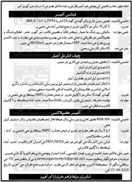 A Private Company, Karachi invites applications for the following positions as advertised in the Daily Kawish on 21 April, 2025: