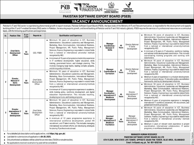 Pakistan Software Export Board (PSEB), Blue Area Islamabad, invites applications for the following positions as advertised in the Nation on 19 April, 2025: