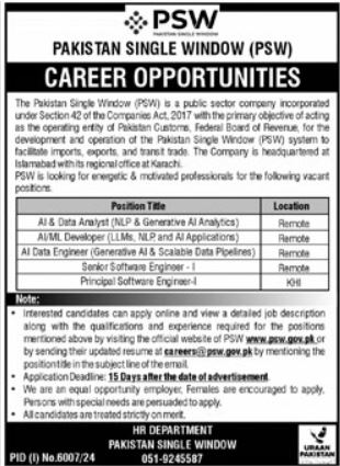 PSW Pakistan Single Window Islamabad Jobs 2025