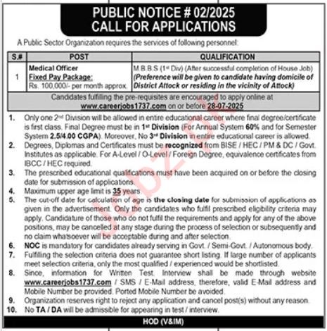 Public Sector Organization invites applications for the position of Medical Officer as per advertisement published in Jang Newspaper on 13 July, 2025 for its Quetta office. MBBS qualification is required.