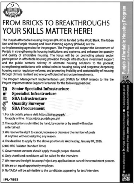 Interested applicants can apply for these latest Government Management jobs in Punjab Affordable Housing Program (PAHP) until 07 January, 2026, or as mentioned in the newspaper advertisement.