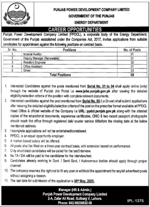 Punjab Power Development Company Limited (PPDCL), under the Energy Department, invites applications for the following positions as advertised in the Express Tribune on 16 April, 2025: