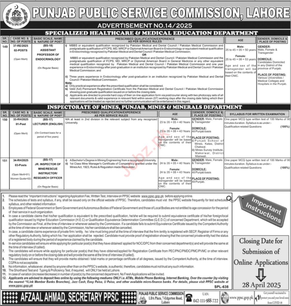 Punjab Public Service Commission PPSC, Egerton Road Lahore, invites applications for the following positions as advertised in the Jang Newspaper on 14 April, 2025: