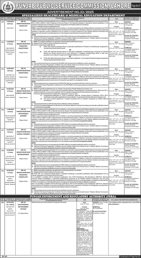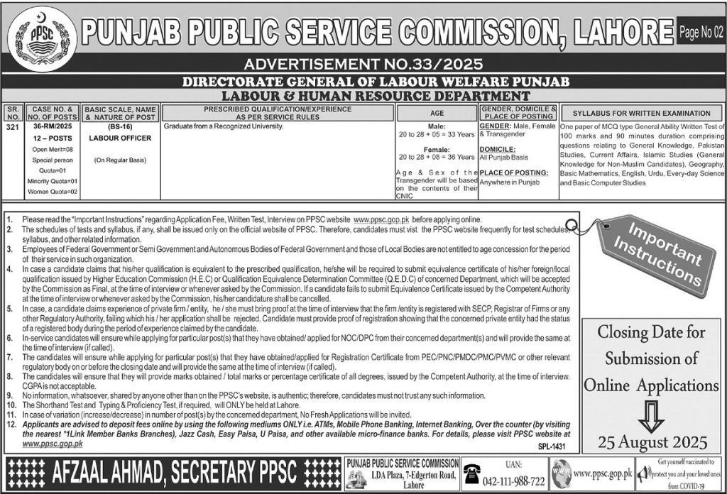 Punjab Public Service Commission (PPSC) invites applications for the above positions as per job advertisement published in the daily Dunya Newspaper on 8 August, 2025 for Lahore, Punjab, Pakistan.