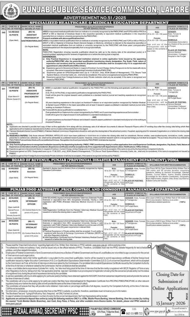 Punjab Public Service Commission PPSC is inviting applications for the following positions as per the advertisement published in the daily Dunya Newspaper dated 31 December, 2025 for Lahore, Punjab, Pakistan: