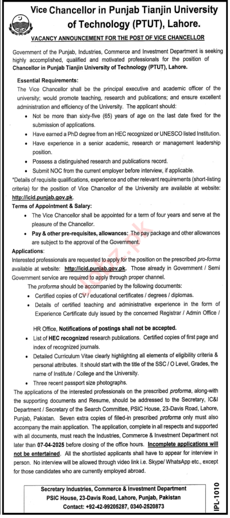 Punjab Tianjin University of Technology (PTUT) invites applications for the following vacancy, as advertised in Express Tribune Newspaper on 17 March, 2025: