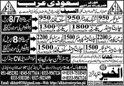 Al Khair Enterprises invites applications for the following overseas construction positions, as advertised in the Express Newspaper on 04 April, 2025, for deployment in Dammam and Riyadh, Saudi Arabia: