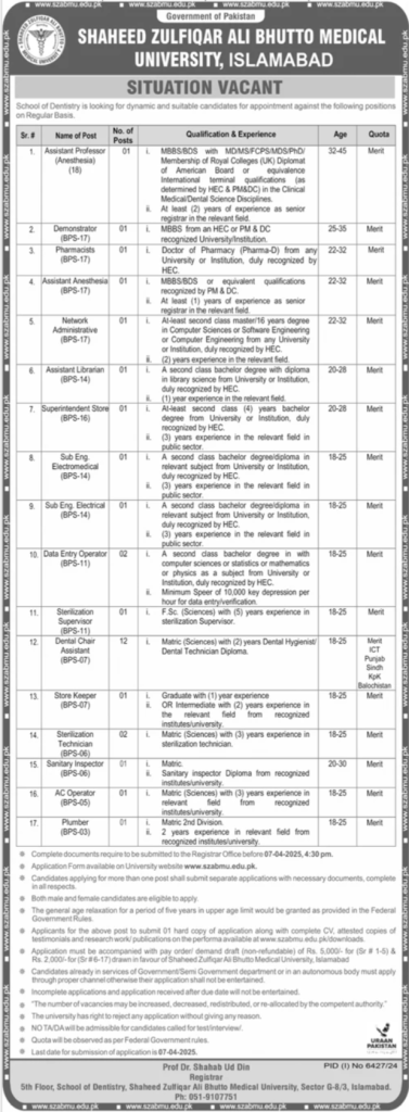 Shaheed Zulfiqar Ali Bhutto Medical University (SZABMU), G-8 Islamabad, invites applications for the following positions, as advertised in Jang Newspaper on 20 March, 2025: