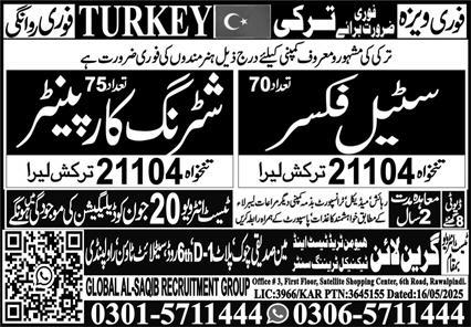 These are full-time overseas jobs based in Turkey. Interested applicants should apply by 20 June, 2025, or according to the deadline stated in the newspaper ad. Read the complete advertisement online for application procedures and further details on the latest job opportunities with Green Line Human Resource Manpower.