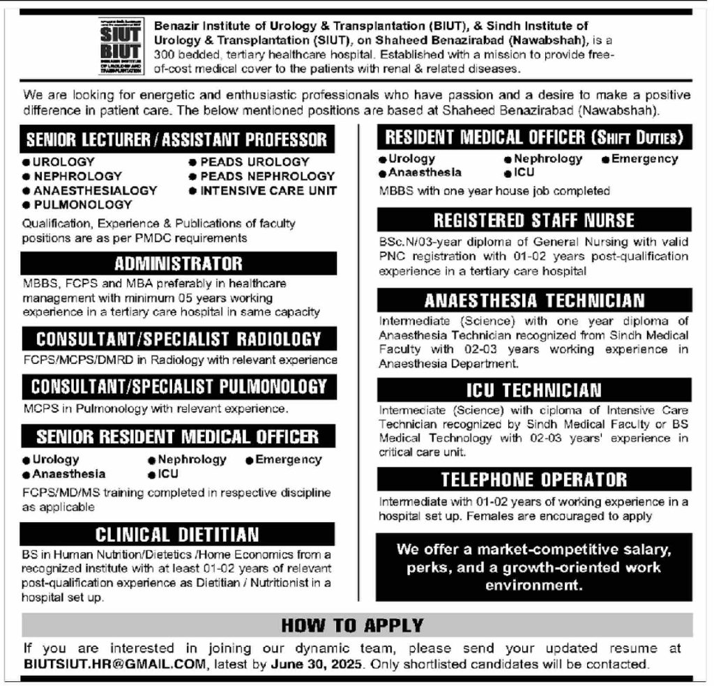 Sindh Institute of Urology and Transplantation (SIUT), Karachi, invites applications for the following positions as advertised in the Dawn Newspaper on 16 June, 2025: