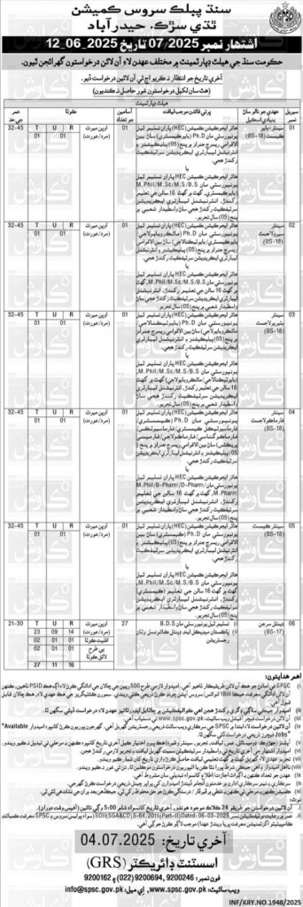 SPSC Sindh Public Service Commission is inviting applications for the following positions as per the job advertisement published in the daily Kawish Newspaper on 13 June, 2025 for Hyderabad, Pakistan: