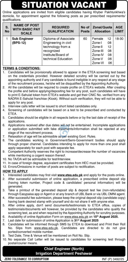 Apply for the latest Government Engineering jobs in Irrigation Department before the closing date of 31 August, 2025 or as per the closing date in the newspaper ad. Read the complete ad online via ETEA to know how to apply.