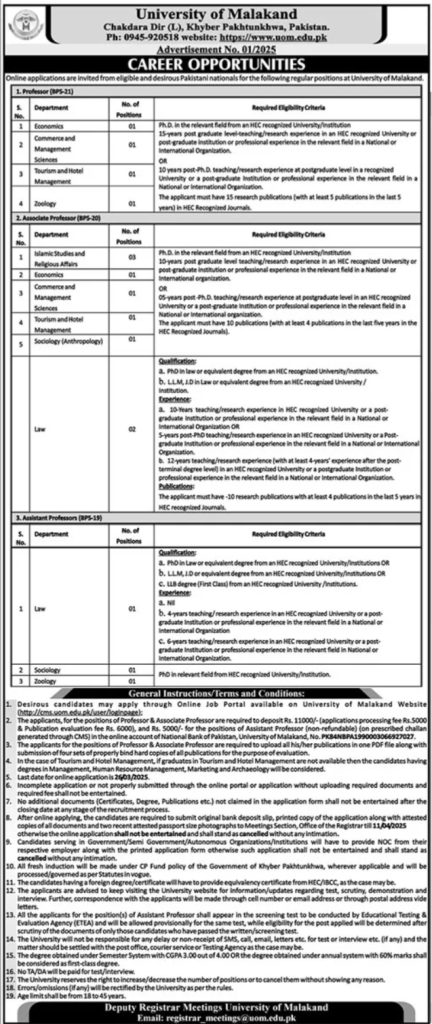The University of Malakand is inviting applications for the following positions, as per the job advertisement published in The News on 13 March, 2025: