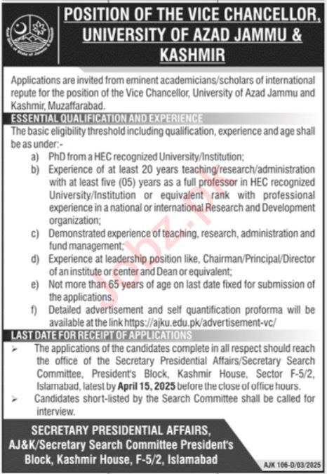 The University of Azad Jammu and Kashmir is looking for candidates for the following position, as advertised in Jang Newspaper on 24 March, 2025: