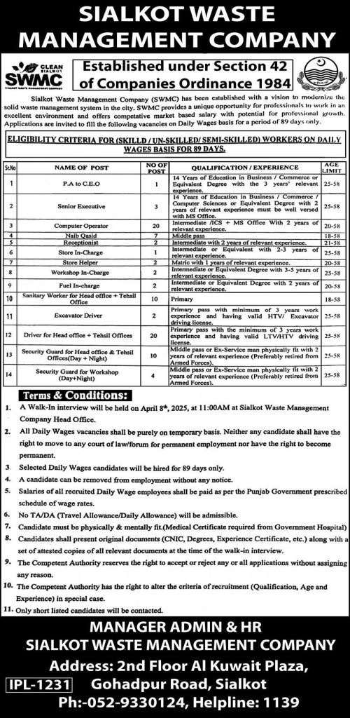 Sialkot Waste Management Company (SWMC), Gohadpur Sialkot, is inviting applications for the following walk-in interview positions, as advertised in the Express Newspaper on 03 April, 2025: