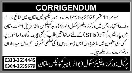 Workers Welfare School Boys Labor Complex Multan Jobs 2025